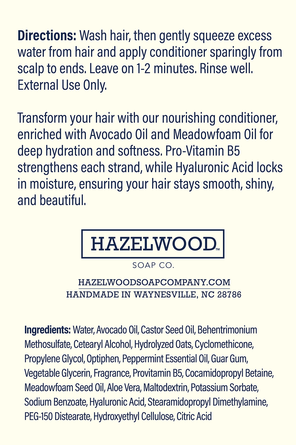 Restore vitality and softness to your hair with this deeply nourishing conditioner, crafted from rich avocado oil and enhanced with Pro-Vitamin B5, cooling peppermint essential oil, and moisturizing meadowfoam oil. Designed by Hazelwood Soap Company for all hair types, it’s especially effective at reviving dry or damaged strands, leaving hair silky, smooth, and refreshed.